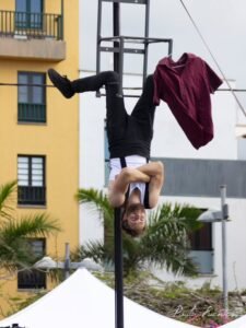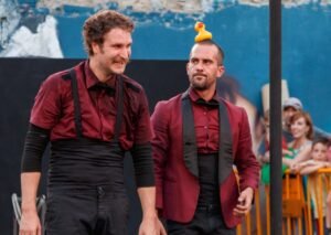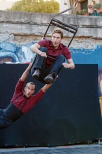 Roda Cyr, malabars, pal xinès, manipulació d’objectes, verticals amb cadires i acrobàcia se succeeixen sobre un escenari on triomfa la llei de qui riu més fort. O de qui fa més gràcia. O de qui té peus. O de qui s’ha deixat el cap a casa. O de qui l’ha perdut i ja no el vol trobar mai més.